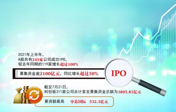 2021年上半年,A股共有245家公司成功IPO,较去年同期的119家增长超过100%;募集资金逾2100亿元,同比增长超过50%,这一数字亦为近10年来的最高值。