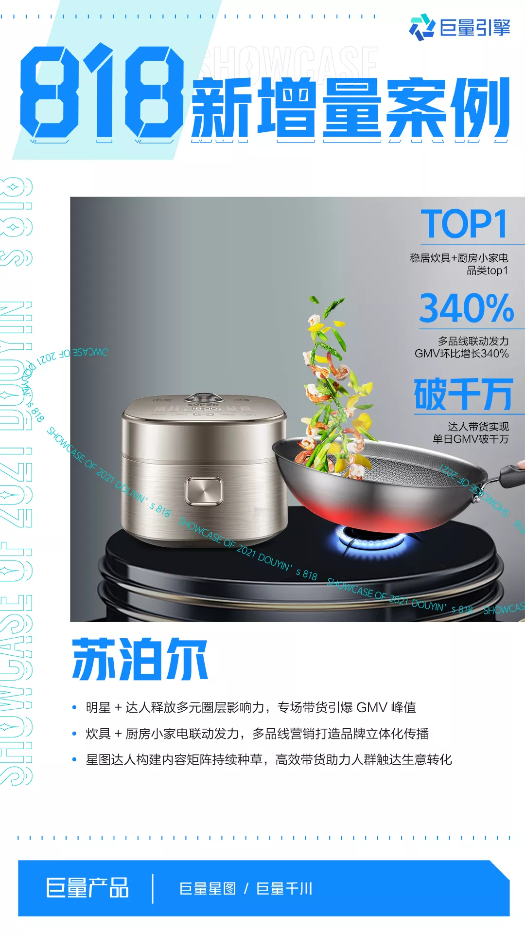 通过巨量千川这一长期经营用户和发展新生意的主阵地 ,我们综合评估GMV绝对值、增长率等指标, 百家好、飞科、罗拉密码、嫚熙、苏泊尔、晓丽衣橱、逸阳等品牌最终上榜。
