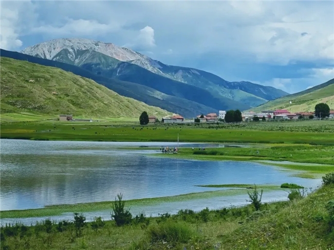 湛蓝的天空、青翠的草原、一望无际地铺开来,湖里水草郁郁葱葱,湖边植被茂密、鲜花遍地,无数水鸟停留此地。丹顶鹤、黄鸭、斑头雁等大量的珍稀鸟类,在这里孕育新的生命。